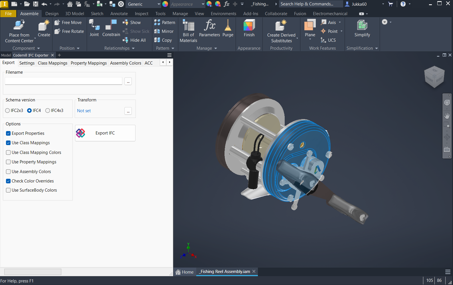 Easiest way to export Inventor assembly is to specify the file name, select schema version and press Export IFC button.