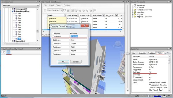 4. Now program is ready to calculate total “Golvarea” of selected objects when used. Note that you can define also other Categories than Database. All properties (real or integer fields) of the Model are available to use.