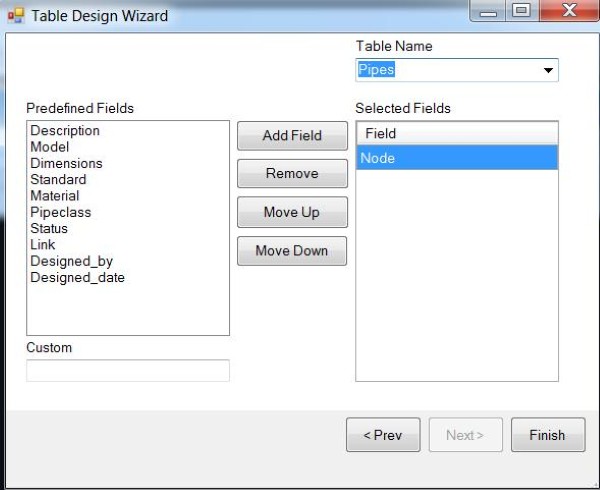 Form contains buttons for adding and removing fields to/from the Selected Fields listbox as well as buttons for moving already added fields to desired order. When all fields are added and sorted to desired order press Finish button to create new table.
