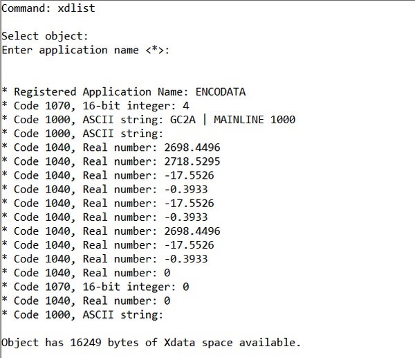 Assuming that we have following xdata (with reqapp ENCODATA) attached to the AutoCAD objects and we want to read 4th and 5th values of it to the Navistools. We also know that these values represent Start Chainage and End Chainage co-oordinates